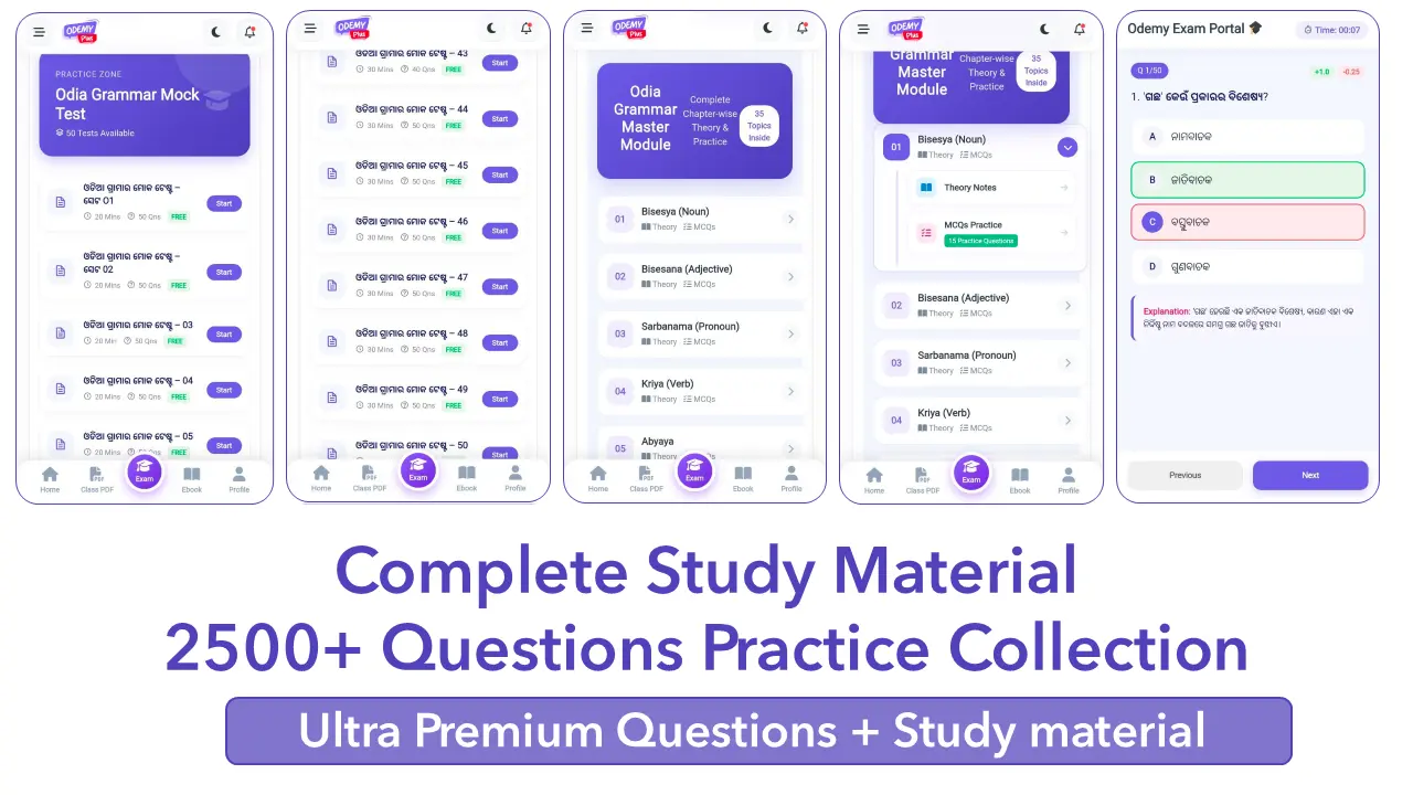 Each set contains carefully selected multiple-choice questions covering important Odia grammar topics such as Sandhi, Samasa, Karaka, Taddhita, Krudanta, Chhanda, Alankara, Synonyms, Antonyms, Idioms, Sentence Correction, and more. Detailed answers are provided after every set to help you understand concepts clearly and improve accuracy.